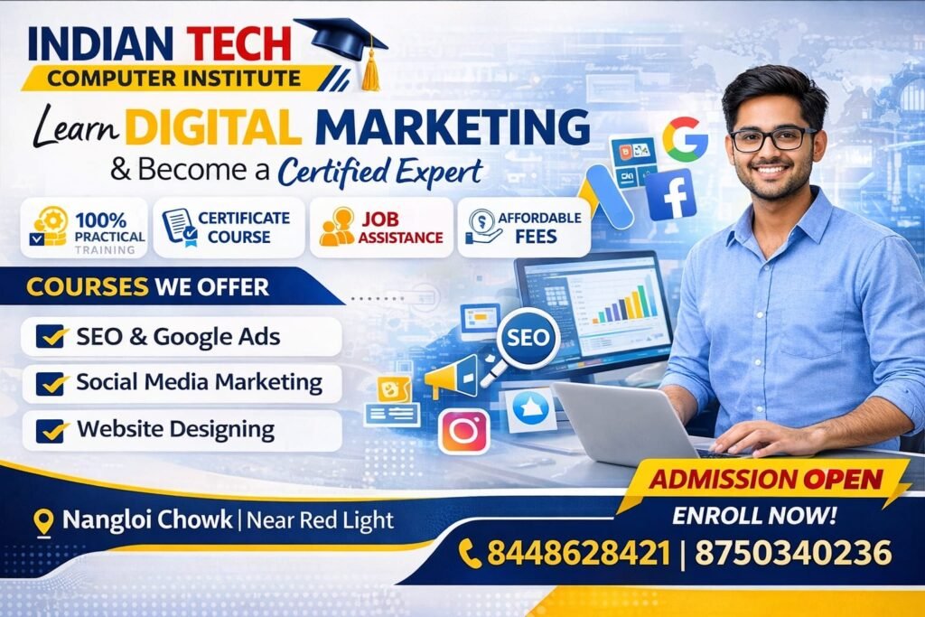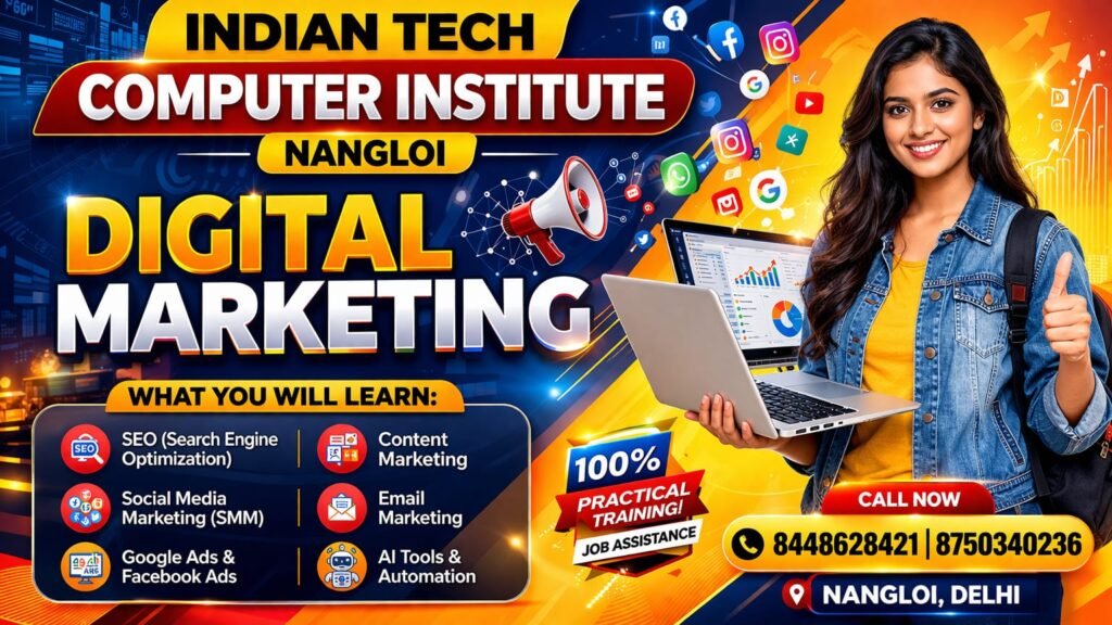 Transform your career with the most Advanced Digital Marketing with AI Course in Nangloi, Delhi at Indian Tech Computer Institute. Learn how to use AI-powered tools and modern marketing strategies to grow businesses, generate leads, and build a stable online income.